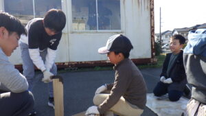 準備段階の薪割りでは、高学年のお兄さん力強くなたを扱う姿を、低学年の子どもたちが真剣な眼差しで見つめていました。そのカッコいい姿に刺激され、低学年の子たちも次々と薪割りに挑戦。「やってみたい!」という意欲が、異年齢集団ならではの自然な形で引き出されていました。